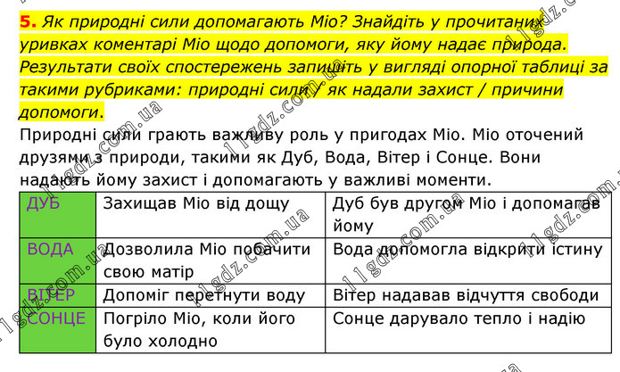 Як природні сили допомагають Міо? Знайдіть у прочитаних уривках коментарі Міо щодо допомоги, яку йому надає природа. Результати своїх спостережень запишіть у вигляді опорної таблиці за такими рубриками: природні сили / як надали захист / причини допомоги. Природні сили грають важливу роль у пригодах Міо. Міо оточений друзями з природи, такими як Дуб, Вода, Вітер і Сонце. Вони надають йому захист і допомагають у важливі моменти. ДУБ Захищав Міо від дощу Дуб був другом Міо і допомагав йому ВОДА Дозволила Міо побачити свою матір Вода допомогла відкрити істину ВІТЕР Допоміг перетнути воду Вітер надавав відчуття свободи СОНЦЕ Погріло Міо, коли його було холодно Сонце дарувало тепло і надію