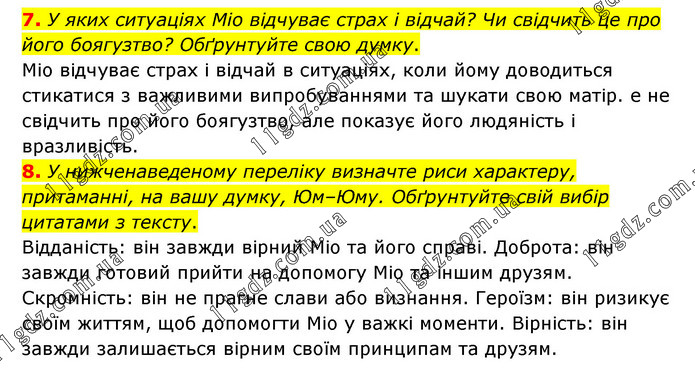 7. У яких ситуаціях Міо відчуває страх і відчай? Чи свідчить це про його боягузтво? Обґрунтуйте свою думку. Міо відчуває страх і відчай в ситуаціях, коли йому доводиться стикатися з важливими випробуваннями та шукати свою матір. е не свідчить про його боягузтво, але показує його людяність і вразливість. 8. У нижченаведеному переліку визначте риси характеру, притаманні, на вашу думку, Юм–Юму. Обґрунтуйте свій вибір цитатами з тексту. Відданість: він завжди вірний Міо та його справі. Доброта: він завжди готовий прийти на допомогу Міо та іншим друзям. Скромність: він не прагне слави або визнання. Героїзм: він ризикує своїм життям, щоб допомогти Міо у важкі моменти. Вірність: він завжди залишається вірним своїм принципам та друзям.