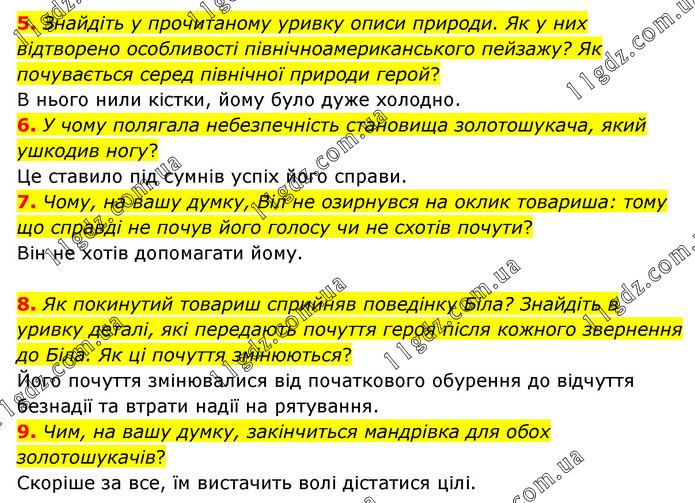 5. Знайдіть у прочитаному уривку описи природи. Як у них відтворено особливості північноамериканського пейзажу? Як почувається серед північної природи герой? В нього нили кістки, йому було дуже холодно. 6. У чому полягала небезпечність становища золотошукача, який ушкодив ногу? Це ставило під сумнів успіх його справи. 7. Чому, на вашу думку, Віл не озирнувся на оклик товариша: тому що справді не почув його голосу чи не схотів почути? Він не хотів допомагати йому. 8. Як покинутий товариш сприйняв поведінку Біла? Знайдіть в уривку деталі, які передають почуття героя після кожного звернення до Біла. Як ці почуття змінюються? Його почуття змінювалися від початкового обурення до відчуття безнадії та втрати надії на рятування. 9. Чим, на вашу думку, закінчиться мандрівка для обох золотошукачів? Скоріше за все, їм вистачить волі дістатися цілі.