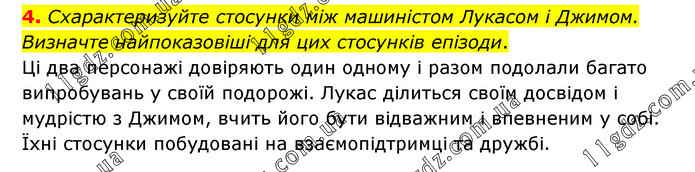 Схарактеризуйте стосунки між машиністом Лукасом і Джимом. Визначте найпоказовіші для цих стосунків епізоди. Ці два персонажі довіряють один одному і разом подолали багато випробувань у своїй подорожі. Лукас ділиться своїм досвідом і мудрістю з Джимом, вчить його бути відважним і впевненим у собі. Їхні стосунки побудовані на взаємопідтримці та дружбі.