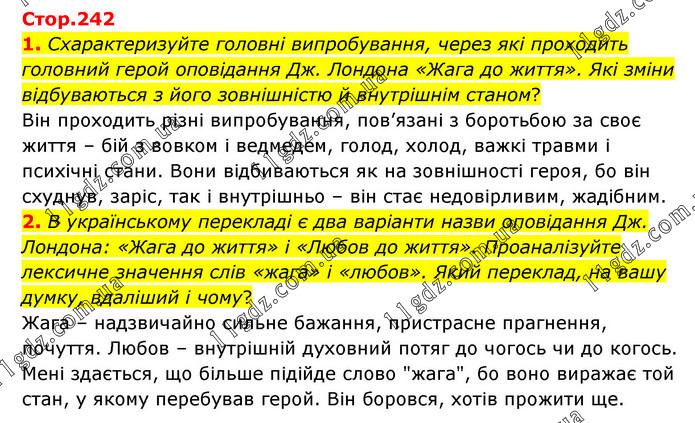 1. Схарактеризуйте головні випробування, через які проходить головний герой оповідання Дж. Лондона «Жага до життя». Які зміни відбуваються з його зовнішністю й внутрішнім станом? Він проходить різні випробування, пов’язані з боротьбою за своє життя – бій з вовком і ведмедем, голод, холод, важкі травми і психічні стани. Вони відбиваються як на зовнішності героя, бо він схуднув, заріс, так і внутрішньо – він стає недовірливим, жадібним. 2. В українському перекладі є два варіанти назви оповідання Дж. Лондона: «Жага до життя» і «Любов до життя». Проаналізуйте лексичне значення слів «жага» і «любов». Який переклад, на вашу думку, вдаліший і чому? Жага – надзвичайно сильне бажання, пристрасне прагнення, почуття. Любов – внутрішній духовний потяг до чогось чи до когось. Мені здається, що більше підійде слово "жага", бо воно виражає той стан, у якому перебував герой. Він боровся, хотів прожити ще.