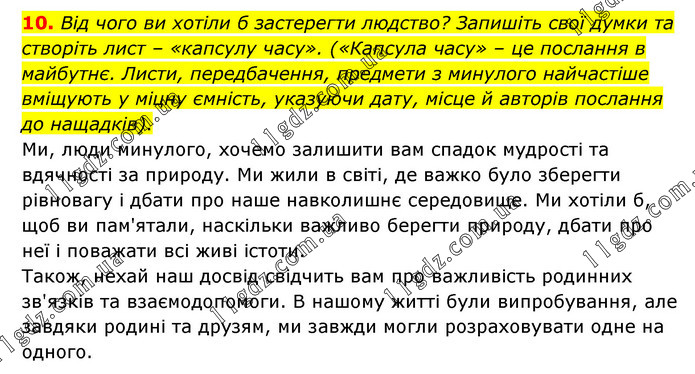 Від чого ви хотіли б застерегти людство? Запишіть свої думки та створіть лист – «капсулу часу». («Капсула часу» – це послання в майбутнє. Листи, передбачення, предмети з минулого найчастіше вміщують у міцну ємність, указуючи дату, місце й авторів послання до нащадків). Ми, люди минулого, хочемо залишити вам спадок мудрості та вдячності за природу. Ми жили в світі, де важко було зберегти рівновагу і дбати про наше навколишнє середовище. Ми хотіли б, щоб ви пам'ятали, наскільки важливо берегти природу, дбати про неї і поважати всі живі істоти. Також, нехай наш досвід свідчить вам про важливість родинних зв'язків та взаємодопомоги. В нашому житті були випробування, але завдяки родині та друзям, ми завжди могли розраховувати одне на одного.