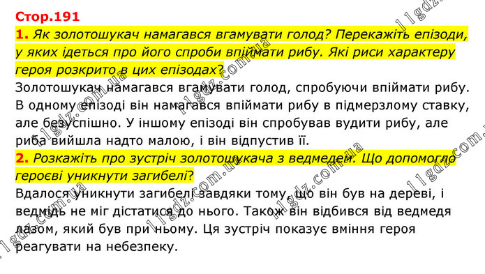 1. Як золотошукач намагався вгамувати голод? Перекажіть епізоди, у яких ідеться про його спроби впіймати рибу. Які риси характеру героя розкрито в цих епізодах? Золотошукач намагався вгамувати голод, спробуючи впіймати рибу. В одному епізоді він намагався впіймати рибу в підмерзлому ставку, але безуспішно. У іншому епізоді він спробував вудити рибу, але риба вийшла надто малою, і він відпустив її. 2. Розкажіть про зустріч золотошукача з ведмедем. Що допомогло героєві уникнути загибелі? Вдалося уникнути загибелі завдяки тому, що він був на дереві, і ведмідь не міг дістатися до нього. Також він відбився від ведмедя лазом, який був при ньому. Ця зустріч показує вміння героя реагувати на небезпеку.