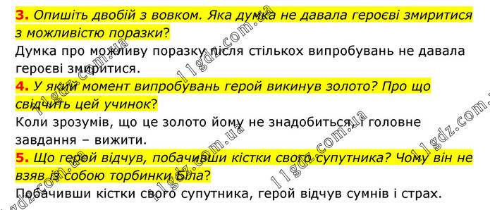 3. Опишіть двобій з вовком. Яка думка не давала героєві змиритися з можливістю поразки? Думка про можливу поразку після стількох випробувань не давала героєві змиритися. 4. У який момент випробувань герой викинув золото? Про що свідчить цей учинок? Коли зрозумів, що це золото йому не знадобиться, і головне завдання – вижити. 5. Що герой відчув, побачивши кістки свого супутника? Чому він не взяв із собою торбинки Біла? Побачивши кістки свого супутника, герой відчув сумнів і страх.