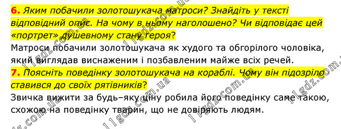 6. Яким побачили золотошукача матроси? Знайдіть у тексті відповідний опис. На чому в ньому наголошено? Чи відповідає цей «портрет» душевному стану героя? Матроси побачили золотошукача як худого та обгорілого чоловіка, який виглядав виснаженим і позбавленим майже всіх речей. 7. Поясніть поведінку золотошукача на кораблі. Чому він підозріло ставився до своїх рятівників? Звичка вижити за будь–яку ціну робила його поведінку саме такою, схожою на поведінку тварин, що не довіряють людям.
