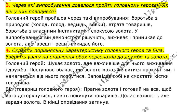 3. Через які випробування довелося пройти головному героєві? Як він у них поводився? Головний герой пройшов через такі випробування: боротьба з природою (холод, голод, ведмідь, вовки), втрата товаришів, боротьба з власними інстинктами і спокусою золота. У випробуваннях він демонструє рішучість, виживає і примикає до золота, але, врешті–решт, викидає його. 4. Складіть порівняльну характеристику головного героя та Біла. Зверніть увагу на ставлення обох персонажів до дружби та золота. Головний герой: Шукає золото, але важливіше для нього виживання і дружба. Поступово вбачає, що золото може виявитися прокляттям, і намагається від нього позбутися. Заповідає собі не смоктати кістки товариша. Біл (товариш головного героя): Прагне золота і готовий на все, щоб його доторкнутися, навіть покинути товариша. Долає важкості, але заради золота. В кінці оповідання загинув.
