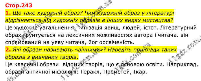 1. Що таке художній образ? Чим художній образ у літературі відрізняється від художніх образів в інших видах мистецтва? Це художнє уагальнення, типізація явищ, людей, істот. Літературний обрах грунтується на лексичних можливостях автора і читача. він спрямований на уяву читача, йог оосвіченість. 2. Які образи називають «вічними»? Наведіть приклади таких образів з вивчених творів. Це класичні образи відомих творів, що є основою освіти. Наприклад, образи античної міфології: Геракл, Прометей, Ікар.