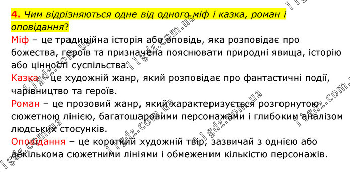 Чим відрізняються одне від одного міф і казка, роман і оповідання? Міф – це традиційна історія або оповідь, яка розповідає про божества, героїв та призначена пояснювати природні явища, історію або цінності суспільства. Казка – це художній жанр, який розповідає про фантастичні події, чарівництво та героїв. Роман – це прозовий жанр, який характеризується розгорнутою сюжетною лінією, багатошаровими персонажами і глибоким аналізом людських стосунків. Оповідання – це короткий художній твір, зазвичай з однією або декількома сюжетними лініями і обмеженим кількістю персонажів.