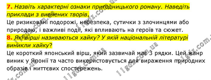 7. Назвіть характерні ознаки пригодницького роману. Наведіть приклади з вивчених творів. Це ризиковані подорожі, небезпека, сутички з злочинцями або природою, і важливі події, які впливають на героїв та сюжет. 8. Які вірші називаються хайку? У якій національній літературі виникли хайку? Це короткий японський вірш, який зазвичай має 3 рядки. Цей жанр виник у Японії та часто використовується для вираження природних образів і миттєвих спостережень.