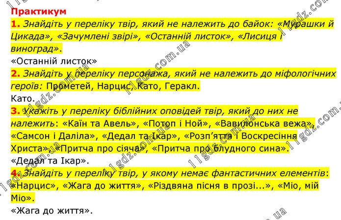 Практикум 1. Знайдіть у переліку твір, який не належить до байок: «Мурашки й Цикада», «Зачумлені звірі», «Останній листок», «Лисиця і виноград». «Останній листок» 2. Знайдіть у переліку персонажа, який не належить до міфологічних героїв: Прометей, Нарцис, Като, Геракл. Като. 3. Укажіть у переліку біблійних оповідей твір, який до них не належить: «Каїн та Авель», «Потоп і Ной», «Вавилонська вежа», «Самсон і Даліла», «Дедал та Ікар», «Розп’яття і Воскресіння Христа», «Притча про сіяча», «Притча про блудного сина». «Дедал та Ікар». 4. Знайдіть у переліку твір, у якому немає фантастичних елементів: «Нарцис», «Жага до життя», «Різдвяна пісня в прозі...», «Міо, мій Міо». «Жага до життя».