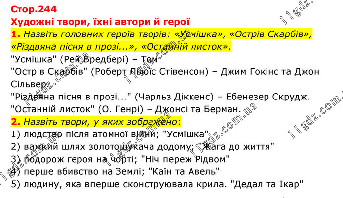 Художні твори, їхні автори й герої 1. Назвіть головних героїв творів: «Усмішка», «Острів Скарбів», «Різдвяна пісня в прозі...», «Останній листок». "Усмішка" (Рей Бредбері) – Том "Острів Скарбів" (Роберт Льюїс Стівенсон) – Джим Гокінс та Джон Сільвер. "Різдвяна пісня в прозі..." (Чарльз Діккенс) – Ебенезер Скрудж. "Останній листок" (О. Генрі) – Джонсі та Берман. 2. Назвіть твори, у яких зображено: 1) людство після атомної війни; "Усмішка" 2) важкий шлях золотошукача додому; "Жага до життя" 3) подорож героя на чорті; "Ніч переж Рідвом" 4) перше вбивство на Землі; "Каїн та Авель" 5) людину, яка вперше сконструювала крила. "Дедал та Ікар"