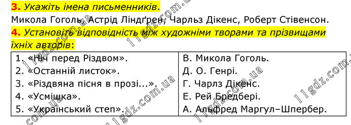 3. Укажіть імена письменників. Микола Гоголь, Астрід Ліндґрен, Чарльз Дікенс, Роберт Стівенсон. 4. Установіть відповідність між художніми творами та прізвищами їхніх авторів: 1. «Ніч перед Різдвом». 2. «Останній листок». 3. «Різдвяна пісня в прозі...». 4. «Усмішка». 5. «Український степ». В. Микола Гоголь. Д. О. Генрі. Г. Чарлз Дікенс. Е. Рей Бредбері. А. Альфред Маргул–Шпербер.