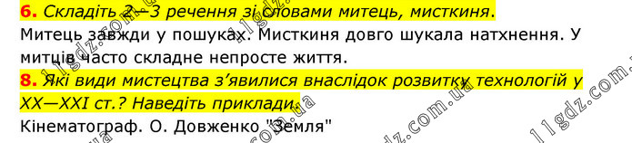 6. Складіть 2—3 речення зі словами митець, мисткиня. Митець завжди у пошуках. Мисткиня довго шукала натхнення. У митців часто складне непросте життя. 8. Які види мистецтва з’явилися внаслідок розвитку технологій у ХХ—ХХІ ст.? Наведіть приклади. Кінематограф. О. Довженко "Земля"