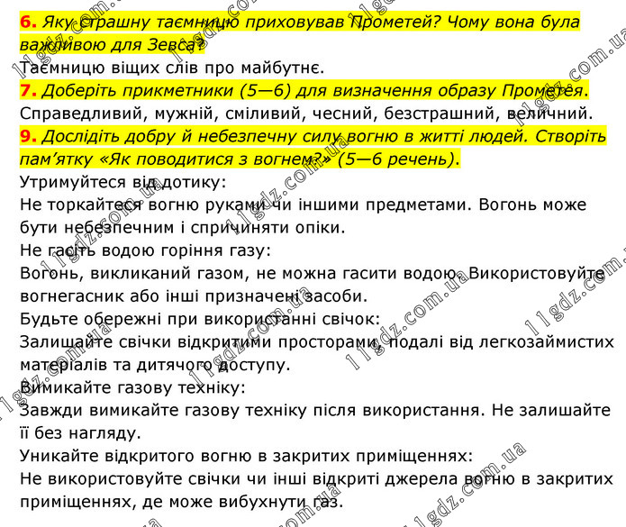 6. Яку страшну таємницю приховував Прометей? Чому вона була важливою для Зевса? Таємницю віщих слів про майбутнє. 7. Доберіть прикметники (5—6) для визначення образу Прометея. Справедливий, мужній, сміливий, чесний, безстрашний, величний. 9. Дослідіть добру й небезпечну силу вогню в житті людей. Створіть пам’ятку «Як поводитися з вогнем?» (5—6 речень). Утримуйтеся від дотику: Не торкайтеся вогню руками чи іншими предметами. Вогонь може бути небезпечним і спричиняти опіки. Не гасіть водою горіння газу: Вогонь, викликаний газом, не можна гасити водою. Використовуйте вогнегасник або інші призначені засоби. Будьте обережні при використанні свічок: Залишайте свічки відкритими просторами, подалі від легкозаймистих матеріалів та дитячого доступу. Вимикайте газову техніку: Завжди вимикайте газову техніку після використання. Не залишайте її без нагляду. Уникайте відкритого вогню в закритих приміщеннях: Не використовуйте свічки чи інші відкриті джерела вогню в закритих приміщеннях, де може вибухнути газ.