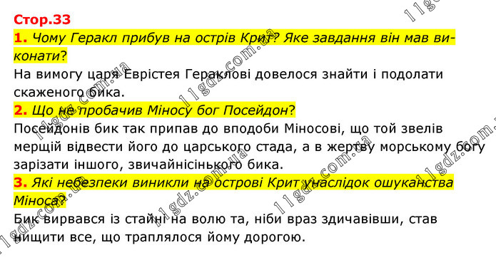 1. Чому Геракл прибув на острів Крит? Яке завдання він мав ви-конати? На вимогу царя Еврістея Гераклові довелося знайти і подолати скаженого бика. 2. Що не пробачив Міносу бог Посейдон? Посейдонів бик так припав до вподоби Міносові, що той звелів мерщій відвести його до царського стада, а в жертву морському богу зарізати іншого, звичайнісінького бика. 3. Які небезпеки виникли на острові Крит унаслідок ошуканства Міноса? Бик вирвався із стайні на волю та, ніби враз здичавівши, став нищити все, що траплялося йому дорогою.
