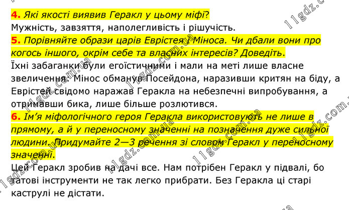 4. Які якості виявив Геракл у цьому міфі? Мужність, завзяття, наполегливість і рішучість. 5. Порівняйте образи царів Еврістея і Міноса. Чи дбали вони про когось іншого, окрім себе та власних інтересів? Доведіть. Їхні забаганки були егоїстичними і мали на меті лише власне звеличення: Мінос обманув Посейдона, наразивши критян на біду, а Еврістей свідомо наражав Геракла на небезпечні випробування, а отримавши бика, лише більше розлютився. 6. Ім’я міфологічного героя Геракла використовують не лише в прямому, а й у переносному значенні на позначення дуже сильної людини. Придумайте 2—3 речення зі словом Геракл у переносному значенні. Цей Геракл зробив на дачі все. Нам потрібен Геракл у підвалі, бо татові інструменти не так легко прибрати. Без Геракла ці старі каструлі не дістати.