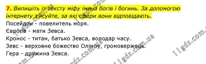 Випишіть із тексту міфу імена богів і богинь. За допомогою інтернету з’ясуйте, за які сфери вони відповідають. Посейдон - повелитель моря. Європа - мати Зевса. Кронос - титан, батько Зевса, володар часу. Зевс - верховне божество Олімпу, громовержець. Гера - дружина Зевса.