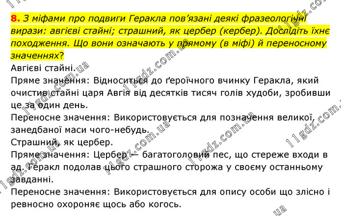 З міфами про подвиги Геракла пов’язані деякі фразеологічні вирази: авгієві стайні; страшний, як цербер (кербер). Дослідіть їхнє походження. Що вони означають у прямому (в міфі) й переносному значеннях? Авгієві стайні. Пряме значення: Відноситься до ґероїчного вчинку Геракла, який очистив стайні царя Авгія від десятків тисяч голів худоби, зробивши це за один день. Переносне значення: Використовується для позначення великої, занедбаної маси чого-небудь. Страшний, як цербер. Пряме значення: Цербер — багатоголовий пес, що стереже входи в ад. Геракл подолав цього страшного сторожа у своєму останньому завданні. Переносне значення: Використовується для опису особи що злісно і ревносно охороняє щось або когось.