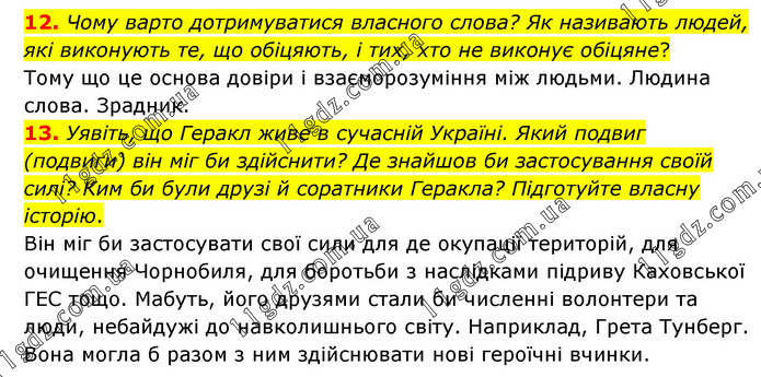 12. Чому варто дотримуватися власного слова? Як називають людей, які виконують те, що обіцяють, і тих, хто не виконує обіцяне? Тому що це основа довіри і взаєморозуміння між людьми. Людина слова. Зрадник. 13. Уявіть, що Геракл живе в сучасній Україні. Який подвиг (подвиги) він міг би здійснити? Де знайшов би застосування своїй силі? Ким би були друзі й соратники Геракла? Підготуйте власну історію. Він міг би застосувати свої сили для де окупації територій, для очищення Чорнобиля, для боротьби з наслідками підриву Каховської ГЕС тощо. Мабуть, його друзями стали би численні волонтери та люди, небайдужі до навколишнього світу. Наприклад, Грета Тунберг. Вона могла б разом з ним здійснювати нові героїчні вчинки.