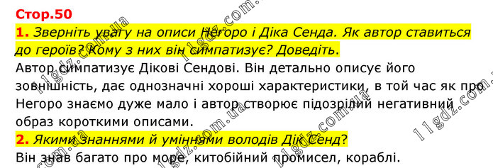 1. Зверніть увагу на описи Негоро і Діка Сенда. Як автор ставиться до героїв? Кому з них він симпатизує? Доведіть. Автор симпатизує Дікові Сендові. Він детально описує його зовнішність, дає однозначні хороші характеристики, в той час як про Негоро знаємо дуже мало і автор створює підозрілий негативний образ короткими описами. 2. Якими знаннями й уміннями володів Дік Сенд? Він знав багато про море, китобійний промисел, кораблі.