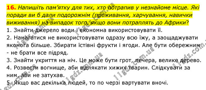Напишіть пам’ятку для тих, хто потрапив у незнайоме місце. Які поради ви б дали подорожнім (проживання, харчування, навички виживання) на випадок того, якщо вони потраплять до Африки? 1. Знайти джерело води і економна використовувати її. 2. Намагатися не використовувати одразу всю їжу, а заощаджувати якомога більше. Збирати їстівні фрукти і ягоди. Але бути обережним - не брати все підряд. 3. Знайти укриття на ніч. Це може бути грот, печера, велике дерево. 4. Розвести вогнище, аби відлякати хижих тварин. Слідкувати за ним, аби не затухав. 5. Якщо вас декілька людей, то по черзі вартувати вночі.