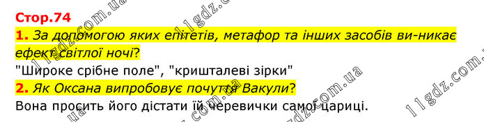 1. За допомогою яких епітетів, метафор та інших засобів ви-никає ефект світлої ночі? "Широке срібне поле", "кришталеві зірки" 2. Як Оксана випробовує почуття Вакули? Вона просить його дістати їй черевички самої цариці.