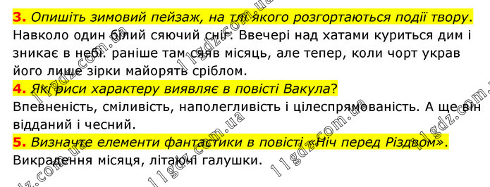 3. Опишіть зимовий пейзаж, на тлі якого розгортаються події твору. Навколо один білий сяючий сніг. Ввечері над хатами куриться дим і зникає в небі. раніше там сяяв місяць, але тепер, коли чорт украв його лише зірки майорять сріблом. 4. Які риси характеру виявляє в повісті Вакула? Впевненість, сміливість, наполегливість і цілеспрямованість. А ще він відданий і чесний. 5. Визначте елементи фантастики в повісті «Ніч перед Різдвом». Викрадення місяця, літаючі галушки.