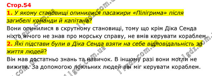 1. У якому становищі опинилися пасажири «Пілігрима» після загибелі команди й капітана? Вони опинилися в скрутному становищі, тому що крім Діка Сенда ніхто нічого не знав про морську справу, не вмів керувати кораблем. 2. Які підстави були в Діка Сенда взяти на себе відповідальність за життя людей? Він мав достатньо знань та навичок. В іншому разі вони могли не вижити. За допомогою лояльних людей він міг керувати кораблем.