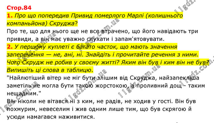 1. Про що попередив Привид померлого Марлі (колишнього компаньйона) Скруджа? Про те, що для нього ще не все втрачено, що його навідають три привиди, а він має уважно слухати і запам'ятовувати. 2. У першому куплеті є багато часток, що мають значення заперечення — не, ані, ні. Знайдіть і прочитайте речення з ними. Чого Скрудж не робив у своєму житті? Яким він був і ким він не був? Випишіть ці слова в таблицю. "Найлютіший вітер не міг бути злішим від Скруджа, найзапекліша заметіль не могла бути такою жорстокою, а проливний дощ - таким нещадним." Він ніколи не вітався ні з ким, не радів, не ходив у гості. Він був похмурим, невеселим і жив одним лише тим, що був скрягою й усюди намагався наживитися.