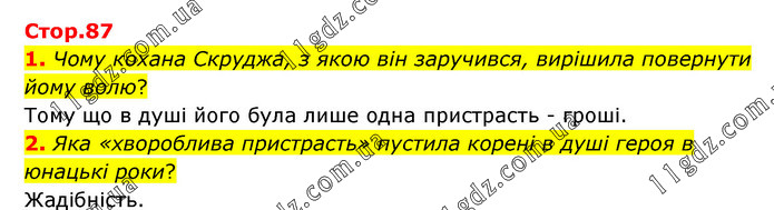 1. Чому кохана Скруджа, з якою він заручився, вирішила повернути йому волю? Тому що в душі його була лише одна пристрасть - гроші. 2. Яка «хвороблива пристрасть» пустила корені в душі героя в юнацькі роки? Жадібність.