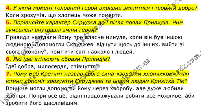 4. У який момент головний герой вирішив змінитися і творити добро? Коли зрозумів, що хлопець може померти. 5. Порівняйте характер Скруджа до і після появи Привидів. Чим зумовлені внутрішні зміни героя? Привиди назгдали йому про власне минуле, коли він був іншою людиною. Допомогли Скруджеві відчути щось до інших, вийти зі свого "кокону", помітити світ навколо і людей. 6. Які ідеї втілюють образи Привидів? Ідеї добра, милосердя, співчуття. 7. Чому Боб Кретчит назвав свого сина «золотим хлопчиком»? Які істини допоміг зрозуміти Скруджеві та іншим людям Крихітка Тім? Вони не могли допомогти йому через хворобу, але дуже любили хлопця. Попри все це, рідні продовжували робити все можливе, аби зробити його щасливішим.