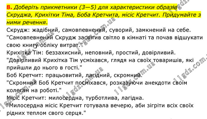 Доберіть прикметники (3—5) для характеристики образів Скруджа, Крихітки Тіма, Боба Кретчита, місіс Кретчит. Придумайте з ними речення. Скрудж: жадібний, самовпевнений, суворий, замкнений на себе. "Самовпевнений Скрудж засвітив світло в кімнаті та почав відшукати свою книгу обліку витрат." Крихітка Тім: беззахисний, неповний, простий, довірливий. "Довірливий Крихітка Тім усміхався, глядя на своїх товаришів, які прийшли до нього в гості." Боб Кретчит: працьовитий, лагідний, скромний. "Скромний Боб Кретчит посміхався, розказуючи анекдоти своїм колегам на роботі." Місіс Кретчит: милосердна, турботлива, лагідна. "Милосердна місіс Кретчит готувала вечерю, аби зігріти всіх своїх рідних теплом свого серця."