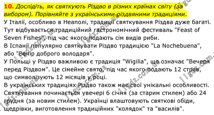 Дослідіть, як святкують Різдво в різних країнах світу (за вибором). Порівняйте з українськими різдвяними традиціями. У Італії, особливо в Неаполі, традиції святкування Різдва дуже багаті. Тут відбувається традиційний гастрономічний фестиваль "Feast of Seven Fishes", під час якого подають сім видів риби. В Іспанії популярно святкувати Різдво традицією "La Nochebuena", або "Вечір доброго володаря". У Польщі у Різдво важливою є традиція "Wigilia", що означає "Вечеря перед Різдвом". Це сімейне свято, під час якого подають 12 страв, що символізують 12 місяців у році. В українських традиціях Різдво також має свої унікальні особливості. Святкування починається увечері 6 січня (за старим стилем) або 24 грудня (за новим стилем). Українці влаштовують святкові обіди, щедрівки, виготовлення традиційних "колядок" та "василів".