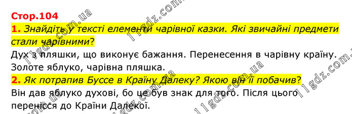 1. Знайдіть у тексті елементи чарівної казки. Які звичайні предмети стали чарівними? Дух з пляшки, що виконує бажання. Перенесення в чарівну країну. Золоте яблуко, чарівна пляшка. 2. Як потрапив Буссе в Країну Далеку? Якою він її побачив? Він дав яблуко духові, бо це був знак для того. Після цього перенісся до Країни Далекої.