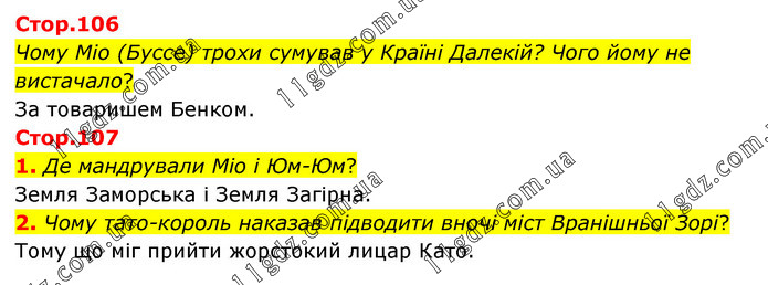 Стор.106 Чому Міо (Буссе) трохи сумував у Країні Далекій? Чого йому не вистачало? За товаришем Бенком. Стор.107 1. Де мандрували Міо і Юм-Юм? Земля Заморська і Земля Загірна. 2. Чому тато-король наказав підводити вночі міст Вранішньої Зорі? Тому що міг прийти жорстокий лицар Като.