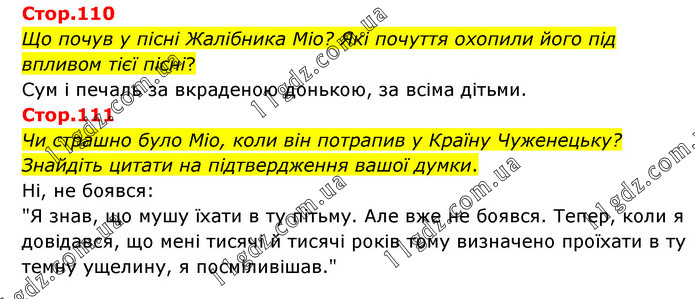 Стор.110 Що почув у пісні Жалібника Міо? Які почуття охопили його під впливом тієї пісні? Сум і печаль за вкраденою донькою, за всіма дітьми. Стор.111 Чи страшно було Міо, коли він потрапив у Країну Чуженецьку? Знайдіть цитати на підтвердження вашої думки. Ні, не боявся: "Я знав, що мушу їхати в ту пітьму. Але вже не боявся. Тепер, коли я довідався, що мені тисячі й тисячі років тому визначено проїхати в ту темну ущелину, я посміливішав."