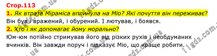 1. Як втрата Міраміса вплинула на Міо? Які почуття він переживає? Він був і вражений, і обурений. І лютував, і боявся. 2. Хто і як допомагає йому морально? Юм-юм потійно стримував його від різких рухів і необдуманих вчинків. Він завжди поруч і підказує Міо, що краще робити.