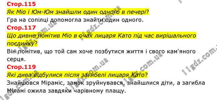 Стор.115 Як Міо і Юм-Юм знайшли один одного в печері? Гра на сопілці допомогла знайти один одного. Стор.117 Що дивне помітив Міо в очах лицаря Като під час вирішального поєдинку? Він помітив, що той сам хоче позбутися життя і свого кам'яного серця. Стор.119 Які дива відбулися після загибелі лицаря Като? Знайшовся Міраміс, замок зруйнувався, знайшлися діти, а загибла Міламі ожила завдяки чарівному плащу.