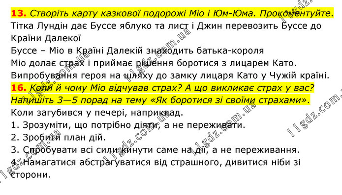 13. Створіть карту казкової подорожі Міо і Юм-Юма. Прокоментуйте. Тітка Лундін дає Буссе яблуко та лист і Джин перевозить Буссе до Країни Далекої Буссе – Міо в Країні Далекій знаходить батька-короля Міо долає страх і приймає рішення боротися з лицарем Като. Випробування героя на шляху до замку лицаря Като у Чужій країні. 16. Коли й чому Міо відчував страх? А що викликає страх у вас? Напишіть 3—5 порад на тему «Як боротися зі своїми страхами». Коли загубився у печері, наприклад. 1. Зрозуміти, що потрібно діяти, а не переживати. 2. Зробити план дій. 3. Спробувати всі сили кинути саме на дії, а не переживання. 4. Намагатися абстрагуватися від страшного, дивитися ніби зі сторони.