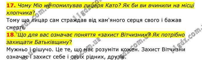17. Чому Міо не помилував лицаря Като? Як би ви вчинили на місці хлопчика? Тому що лицар сам страждав від кам'яного серця свого і бажав смерті. 18. Що для вас означає поняття «захист Вітчизни»? Як потрібно захищати Батьківщину? Мужньо і рішучо. Це те, що має розуміти кожен. Захист Вітчизни означає і захист себе і своїх рідних, друзів.