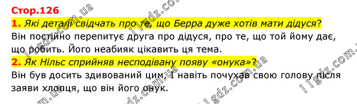1. Які деталі свідчать про те, що Берра дуже хотів мати дідуся? Він постійно перепитує друга про дідуся, про те, що той йому дає, що робить. Його неабияк цікавить ця тема. 2. Як Нільс сприйняв несподівану появу «онука»? Він був досить здивований цим. І навіть почухав свою голову після заяви хлопця, що він його онук.