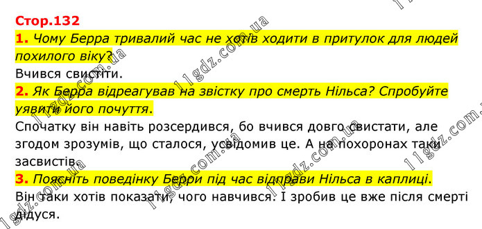 1. Чому Берра тривалий час не хотів ходити в притулок для людей похилого віку? Вчився свистіти. 2. Як Берра відреагував на звістку про смерть Нільса? Спробуйте уявити його почуття. Спочатку він навіть розсердився, бо вчився довго свистати, але згодом зрозумів, що сталося, усвідомив це. А на похоронах таки засвистів. 3. Поясніть поведінку Берри під час відправи Нільса в каплиці. Він таки хотів показати, чого навчився. І зробив це вже після смерті дідуся.