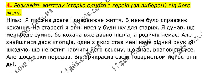 Розкажіть життєву історію одного з героїв (за вибором) від його імені. Нільс: Я прожив довге і дивовижне життя. В мене було справжнє кохання. На старості я опинився у будинку для старих. Я думав, що мені буде сумно, бо кохана вже давно пішла, а родичів немає. Але знайшлися двоє хлопців, один з яких став мені наче рідний онук. Я шкодую, що не встиг навчити його всьому, що знав, розповісти усе. Але щось таки передав. Він прикрасив своїм товариством мої останні дні.