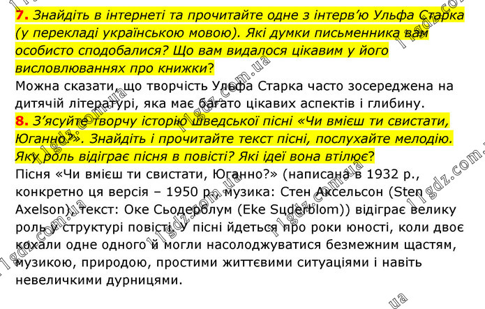 7. Знайдіть в інтернеті та прочитайте одне з інтерв’ю Ульфа Старка (у перекладі українською мовою). Які думки письменника вам особисто сподобалися? Що вам видалося цікавим у його висловлюваннях про книжки? Можна сказати, що творчість Ульфа Старка часто зосереджена на дитячій літературі, яка має багато цікавих аспектів і глибину. 8. З’ясуйте творчу історію шведської пісні «Чи вмієш ти свистати, Юганно?». Знайдіть і прочитайте текст пісні, послухайте мелодію. Яку роль відіграє пісня в повісті? Які ідеї вона втілює? Пісня «Чи вмієш ти свистати, Юганно?» (написана в 1932 р., конкретно ця версія – 1950 р., музика: Стен Аксельсон (Sten Axelson), текст: Оке Сьодерблум (Еke Sцderblom)) відіграє велику роль у структурі повісті. У пісні йдеться про роки юності, коли двоє кохали одне одного й могли насолоджуватися безмежним щастям, музикою, природою, простими життєвими ситуаціями і навіть невеличкими дурницями.