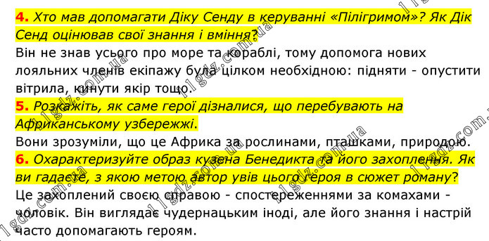 4. Хто мав допомагати Діку Сенду в керуванні «Пілігримом»? Як Дік Сенд оцінював свої знання і вміння? Він не знав усього про море та кораблі, тому допомога нових лояльних членів екіпажу була цілком необхідною: підняти - опустити вітрила, кинути якір тощо. 5. Розкажіть, як саме герої дізналися, що перебувають на Африканському узбережжі. Вони зрозуміли, що це Африка за рослинами, пташками, природою. 6. Охарактеризуйте образ кузена Бенедикта та його захоплення. Як ви гадаєте, з якою метою автор увів цього героя в сюжет роману? Це захоплений своєю справою - спостереженнями за комахами - чоловік. Він виглядає чудернацьким іноді, але його знання і настрій часто допомагають героям.