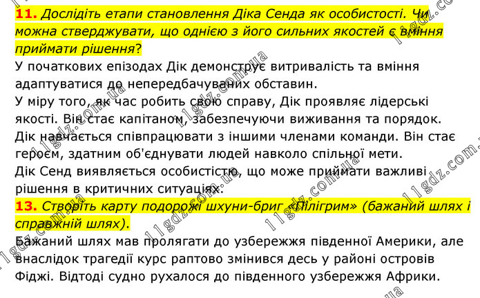 11. Дослідіть етапи становлення Діка Сенда як особистості. Чи можна стверджувати, що однією з його сильних якостей є вміння приймати рішення? У початкових епізодах Дік демонструє витривалість та вміння адаптуватися до непередбачуваних обставин. У міру того, як час робить свою справу, Дік проявляє лідерські якості. Він стає капітаном, забезпечуючи виживання та порядок. Дік навчається співпрацювати з іншими членами команди. Він стає героєм, здатним об'єднувати людей навколо спільної мети. Дік Сенд виявляється особистістю, що може приймати важливі рішення в критичних ситуаціях. 13. Створіть карту подорожі шхуни-бриг «Пілігрим» (бажаний шлях і справжній шлях). Бажаний шлях мав пролягати до узбережжя південної Америки, але внаслідок трагедії курс раптово змінився десь у районі островів Фіджі. Відтоді судно рухалося до південного узбережжя Африки.