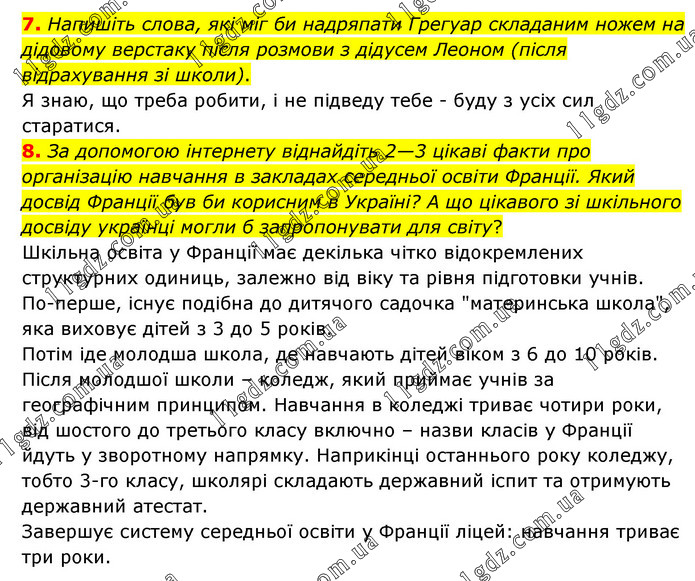 7. Напишіть слова, які міг би надряпати Грегуар складаним ножем на дідовому верстаку після розмови з дідусем Леоном (після відрахування зі школи). Я знаю, що треба робити, і не підведу тебе - буду з усіх сил старатися. 8. За допомогою інтернету віднайдіть 2—3 цікаві факти про організацію навчання в закладах середньої освіти Франції. Який досвід Франції був би корисним в Україні? А що цікавого зі шкільного досвіду українці могли б запропонувати для світу? Шкільна освіта у Франції має декілька чітко відокремлених структурних одиниць, залежно від віку та рівня підготовки учнів. По-перше, існує подібна до дитячого садочка "материнська школа", яка виховує дітей з 3 до 5 років. Потім іде молодша школа, де навчають дітей віком з 6 до 10 років. Після молодшої школи – коледж, який приймає учнів за географічним принципом. Навчання в коледжі триває чотири роки, від шостого до третього класу включно – назви класів у Франції йдуть у зворотному напрямку. Наприкінці останнього року коледжу, тобто 3-го класу, школярі складають державний іспит та отримують державний атестат. Завершує систему середньої освіти у Франції ліцей: навчання триває три роки.
