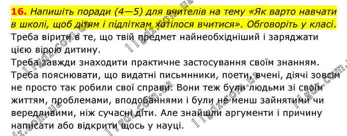 Напишіть поради (4—5) для вчителів на тему «Як варто навчати в школі, щоб дітям і підліткам хотілося вчитися». Обговоріть у класі. Треба вірити в те, що твій предмет найнеобхідніший і заряджати цією вірою дитину. Треба завжди знаходити практичне застосування своїм знанням. Треба пояснювати, що видатні письмнники, поети, вчені, діячі зовсім не просто так робили свої справи. Вони теж були людьми зі своїм життям, проблемами, вподобаннями і були не менш зайнятими чи вередливими, ніж сучасні діти. Але знайшли аргументи і причину написати або відкрити щось у науці.