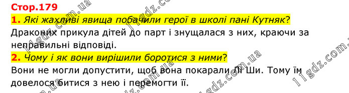 1. Які жахливі явища побачили герої в школі пані Кутняк? Драконих прикула дітей до парт і знущалася з них, краючи за неправильні відповіді. 2. Чому і як вони вирішили боротися з ними? Вони не могли допустити, щоб вона покарали Лі Ши. Тому їм довелося битися з нею і перемогти її.