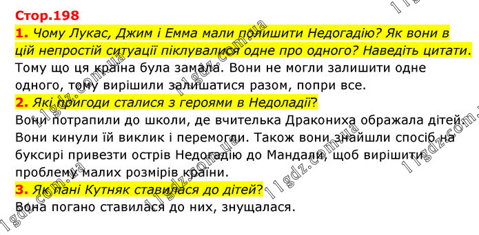 1. Чому Лукас, Джим і Емма мали полишити Недогадію? Як вони в цій непростій ситуації піклувалися одне про одного? Наведіть цитати. Тому що ця країна була замала. Вони не могли залишити одне одного, тому вирішили залишатися разом, попри все. 2. Які пригоди сталися з героями в Недоладії? Вони потрапили до школи, де вчителька Дракониха ображала дітей. Вони кинули їй виклик і перемогли. Також вони знайшли спосіб на буксирі привезти острів Недогадію до Мандали, щоб вирішити проблему малих розмірів країни. 3. Як пані Кутняк ставилася до дітей? Вона погано ставилася до них, знущалася.